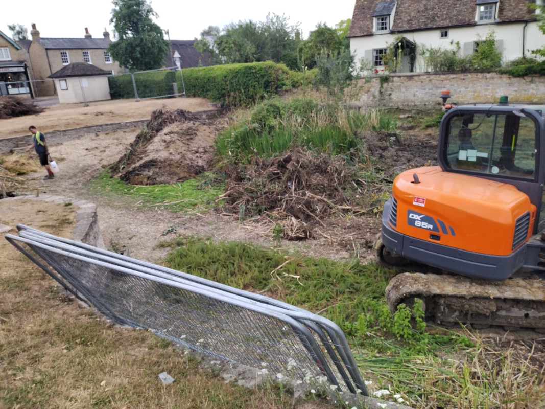 Work on the village pond started on Monday 25th July and was expected to last three weeks. During that timeframe the area around the village pond was inaccessible, protected by fencing. Residents should take care around the site, particularly when contractor vehicles are moving around the site. They will be removing the island, dredging the silt, deepening the pond, removing the plants, repairing the brick work and then adding plants at the end of the project. It is not being re-lined.